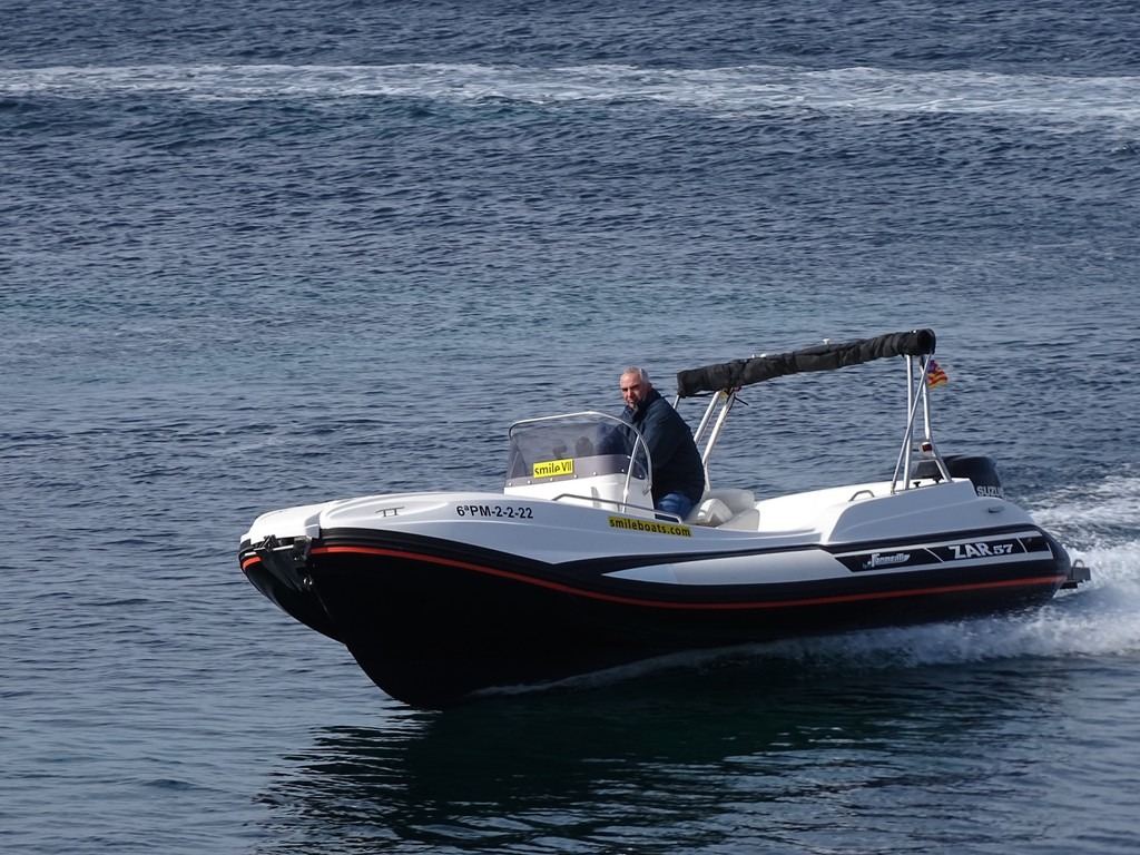 Rent a private rigid boat in Can Pastilla to discover hidden coves, turquoise waters. Sail freely aboard a private rigid boat in Majorca, fully equipped with everything you need to enjoy a boat excursion. Ideal for family or trips with friends, perfect for groups of up to 8 people who want to explore Palma Bay by boat. Boat equipped with powerful engine, freshwater shower, spacious bow solarium, sunshade canopy, sound system, and tow point for wakeboarding or donut rides. Whether you're looking for a relaxing boat trip or a fun-filled day at sea- this boat is your best choice.