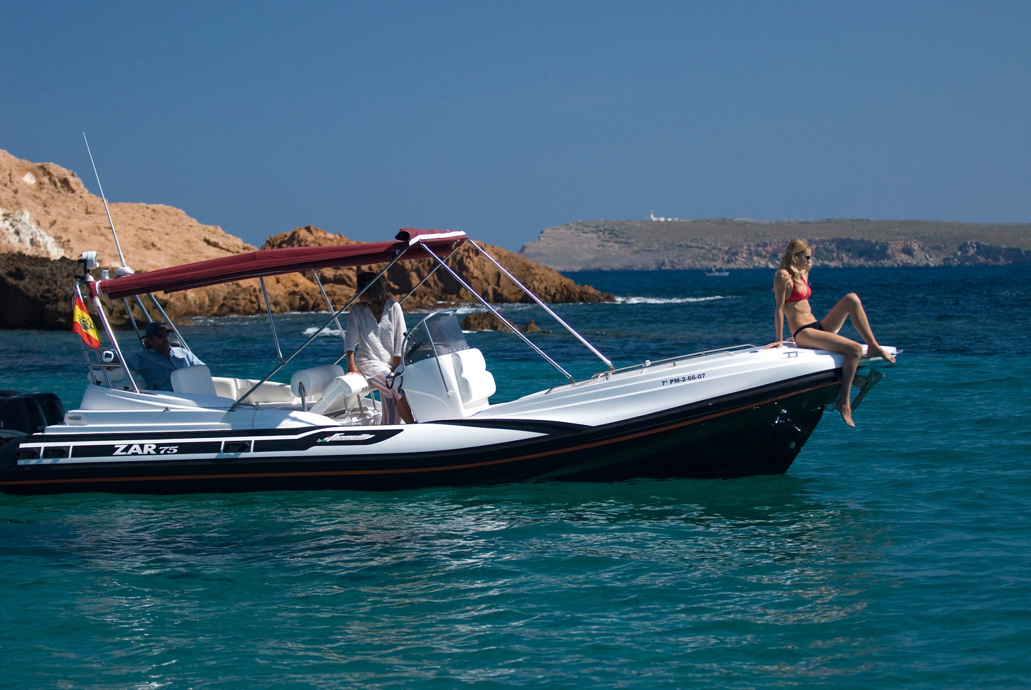 Private RIB for rent in Puerto Pollenca. With space for up to 12 people, you can stay together as one group and explore the beautiful north coast. Fast, spacious, and flexible -perfect for birthdays, celebrations, or simply enjoying a great time with friends, it’s a unique and unforgettable plan. Equipped with an ice cooler, toilet, sunbathing areas at the bow and stern, and a freshwater shower- everything for your comfort.